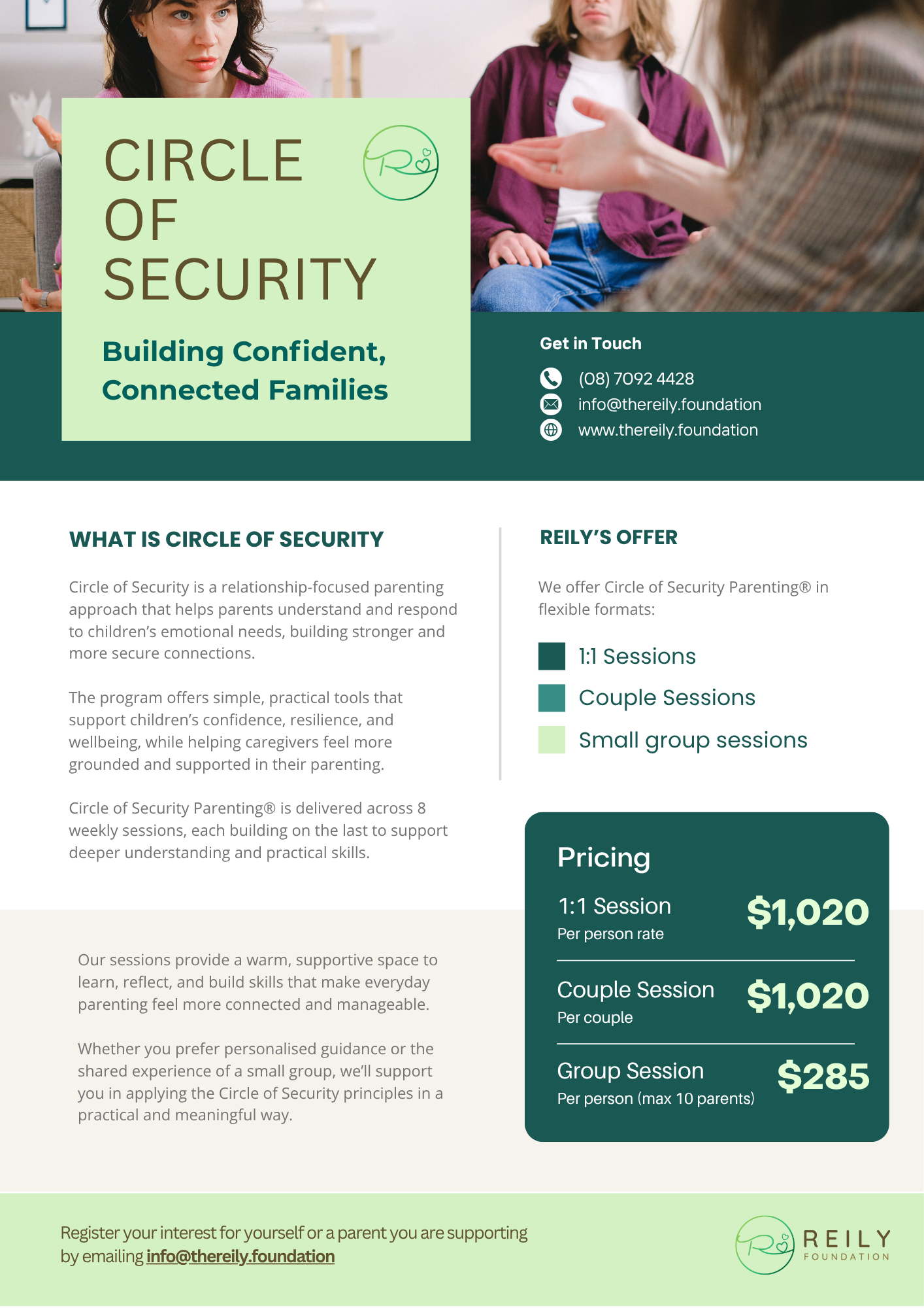 The program offers simple, practical tools that support children’s confidence, resilience, and wellbeing, while helping caregivers feel more grounded and supported in their parenting. Circle of Security Parenting® is delivered across 8 weekly sessions, each building on the last to support deeper understanding and practical skills.